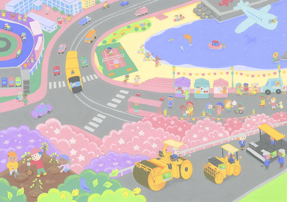 2022年から描き下ろしをお願いしてきたmatokaさんに、今回で4作目となる作品をお願いしました。道づくり街づくりが支えるみんなの笑顔