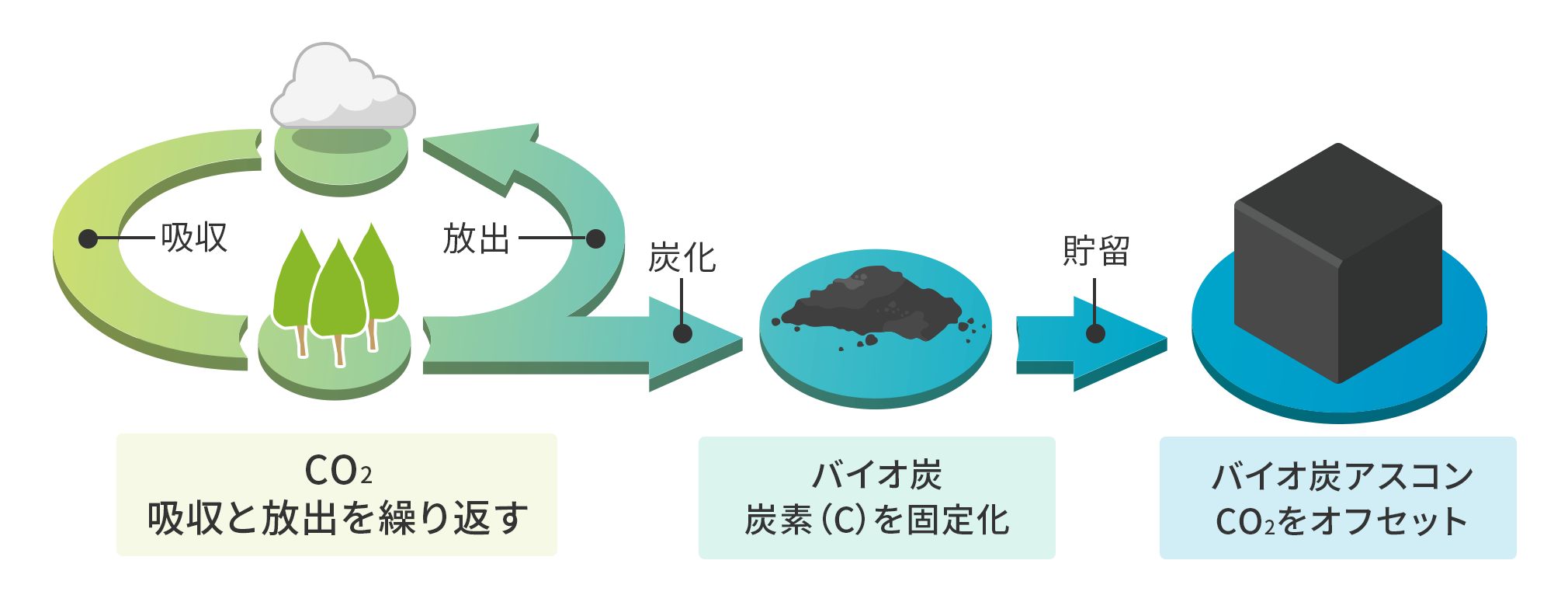 バイオ炭アスコンとは、木材を炭にしたバイオ炭を配合したアスファルト舗装材です。成長過程で空気中のCO₂を吸収した木を炭にすることで、アスファルト舗装内に炭素を長期間閉じ込めることができます。道路をつくりながらCO₂を減らして「カーボンニュートラル」を実現した業界初の技術です。従来の工法と同じ方法で施工できるため、現場で働く方もスムーズに作業ができます。また、品質や耐久性を維持したまま環境負荷を下げて、地球にやさしい道路舗装が可能となりました。