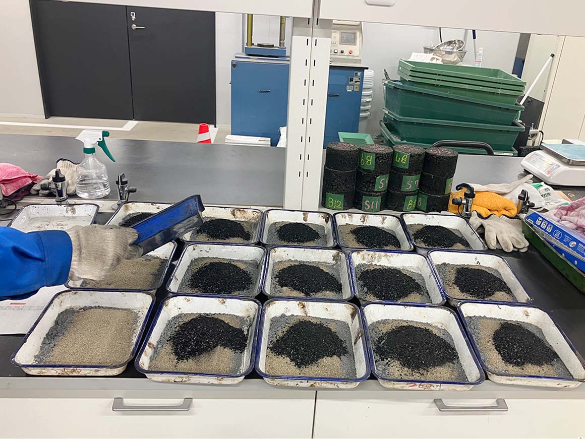 配合のバランスを考えるのも大変でしたね。バイオ炭はアスファルトの吸水性が高く、配合率を高くするとアスファルトを多く必要とするためにコストが高くなってしまいます。一方で、配合率が低すぎるとカーボンニュートラルを達成できません。1%ずつ段階的に配合率を上げて試験を重ね、機能とコストのバランスから3%が最適解という結論に至りました。