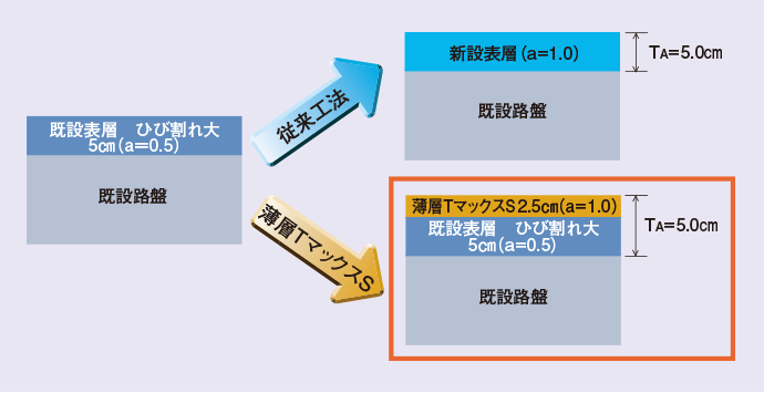 - 標準厚さが20~25mmと薄く、路面切削を必要としない工法であり、経済的です。
