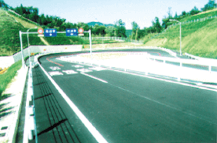 高速道路をモデルとしてつくられた高速体験コースです。コースは、速度70km/h以上で走行できる規模と、高速道路の運転中に遭遇する種々の設備(トンネル・降雨・横風発生装置等)があります。